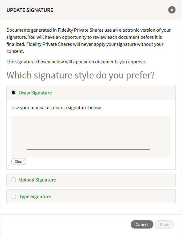 Click Update Signature. Select to either draw your signature, upload an image file of your signature, or use a typed/printed signature.