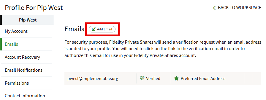 Navigate to the Emails page to manage the email addresses associated with your profile. Emails on your account must be verified before they can be used in the platform. To add a new email, click the Add Email button.