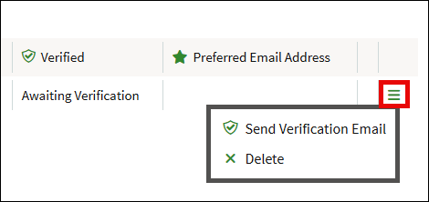 After you add a new email address a message is sent with a link to confirm that email address. After you click the verification link, you will be able to add that email to the verified list. To resend the verification, or to delete a pending email, click the three-bar menu to the right of the email.