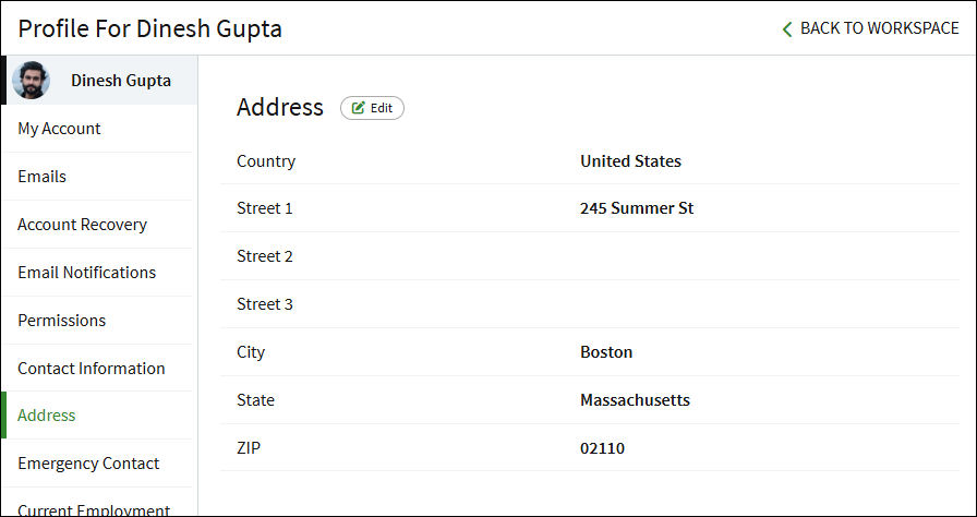 There are pages for changing your contact information, address, and emergency contact information on the My Profile page. To add or edit your address, click the Edit button.