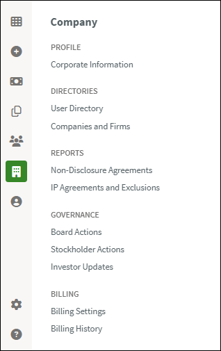 This panel has quick links to different parts of the platform (Workspaces, Workflows, Equity, Data Room, Human Resources, Company, and My Workspace), a direct link to the Administration workspace (if that permission has been granted to you), and the Help menu. Clicking on an icon will expand the panel with a list of available links and actions.