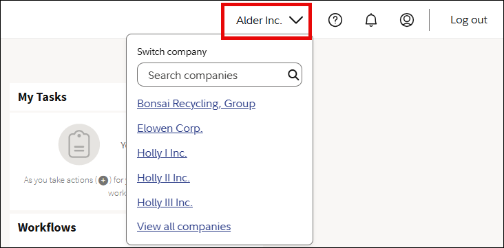 Some users have multiple companies and/or multiple roles within a given company. To change to a different company, click on the company name on the top menu bar and select from the list of available companies. The Workspace will change to reflect the workflows and modules related to that company.