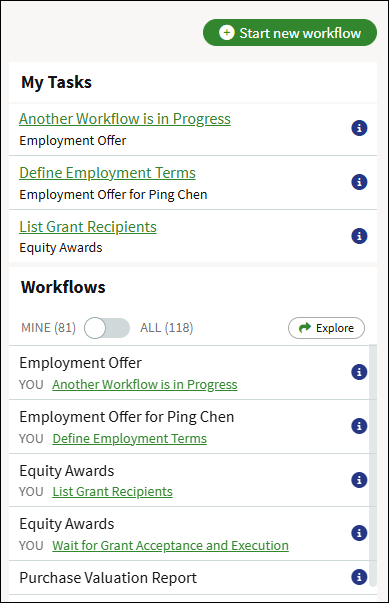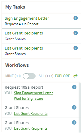 Any pending tasks will display in the My Tasks panel. For greater details, you can use the Workflows list. From there you can click on the name of a task, the information button, or click Explore to view the list of stakeholders involved in a workflow, related documents and emails, and more.