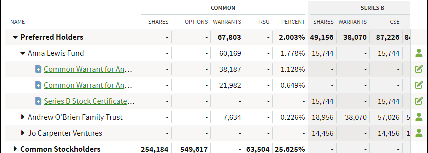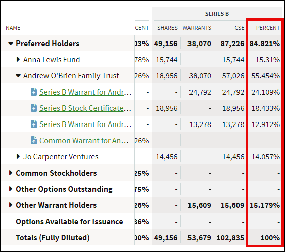 In the Cap Table, each line item displays the ownership of shares, options, or alternatives/debt for each holder. The Percent column calculates the percent ownership for each of these stockholders based on the number of shares issued for each class of stock. For instance, using the screenshot below, the Andrew O'Brien Family Trust owns 55.454% of the Series B shares. In other words, they own 57,026 shares of Series B shares, when divided by the total number of shares issued by the company (102,835), yields a 55.454% ownership of Series B stock.