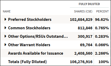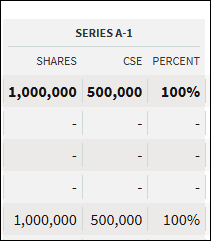 The Cap Table will list each class of stock as well as the CSE ownership for each holder. CSE is the Common Stock Equivalent, and it is a calculation used for preferred stock classes where the terms of the stock class may state that one share of preferred stock will convert into common stock at a specified ratio. If the conversion ratio is one to one, the CSE will be the same as the number of issued shares. In the example below, the Series A-1 Preferred has a 2:1 conversion ratio which is applied in the CSE column.