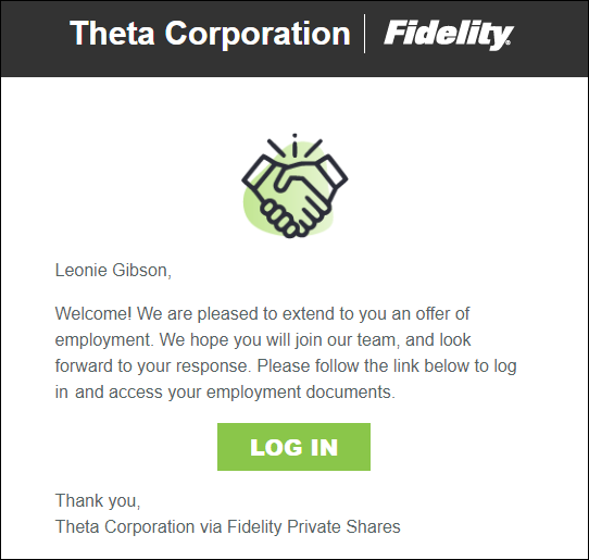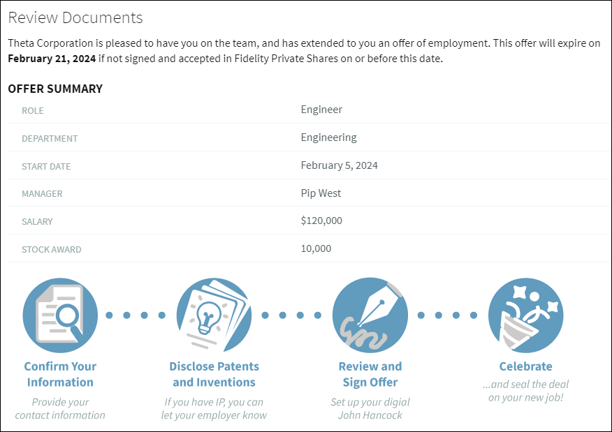Companies that use Fidelity Private Shares can use the platform to send job offers and the necessary new hire paperwork. You can review your offer, confirm your information, disclose any existing IP, and sign all of your documents through Fidelity Private Shares.