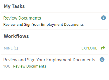 Once you have created your account and have logged in, you will be prompted to review and sign your employee documents. If this screen does not open automatically, there will be a link in the right side of the workspace in the My Tasks section.