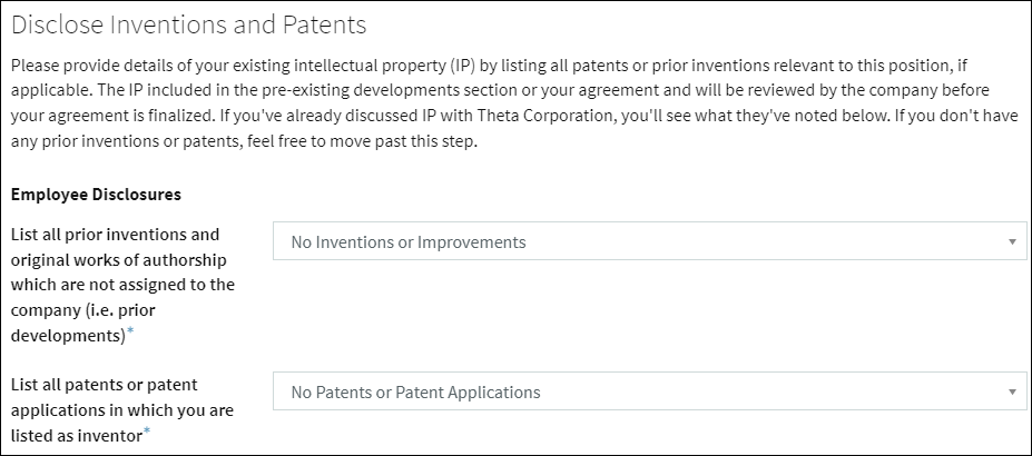 If you have any existing patents or prior inventions, you can list them here. If you have previously discussed your IP with the company, they may have provided a list that you can review. If this is not applicable to you, you can move past this step.