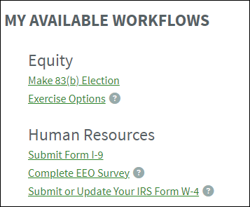 You can now complete any HR forms that the company has set up in their HR Settings (such as the W-4 and I-9, EEO Survey, or benefits enrollment forms). Click on Start New Workflow from your workspace to get started.